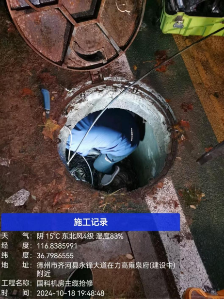 10月18日晚,德州齐河分公司经开区国科机房传输信号中断,出现断网故障。齐河分公司立即响应,迅速启动应急抢修预案,10分钟内技术抢修队伍火速赶往故障现场。凭借丰富的经验和专业技能,第一时间找到管井内故障点。然而延伸管井损坏,淤泥掩埋导致无法进行光缆更换,抢修人员只得清理井下杂物后下到管井内对故障光缆熔接。经过2小时40分钟连续奋战,成功修复光缆。