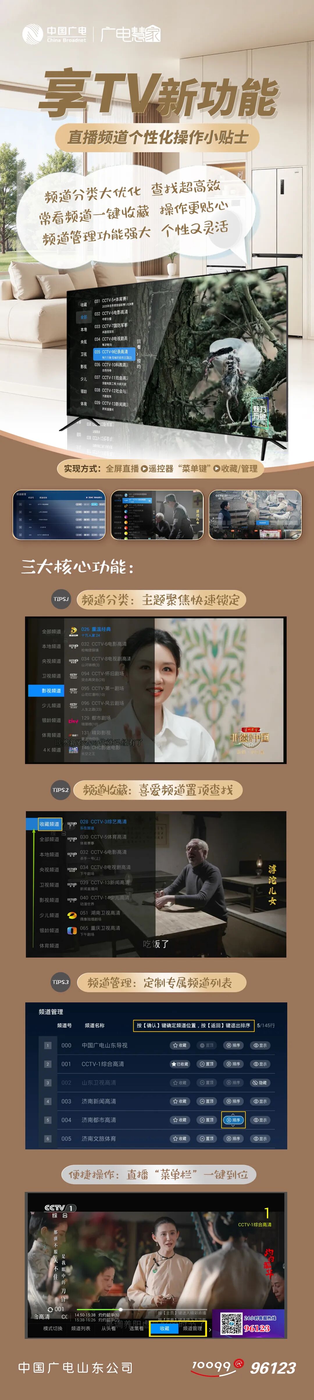 直播菜单栏新增“频道管理”入口,在这里可以进行收藏、置顶、排序、显示/隐藏设置,让您能定制自己的专属频道列表,新增频道会标“新增”标识,不怕错过新台。