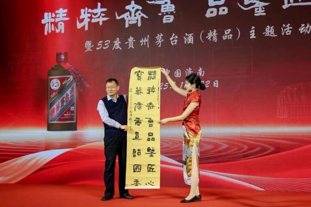 书法家王克以本次活动主题为灵感,向宝真酒业赠送了一幅寓意深远的书法作品——"精粹齐鲁品鉴匠心,宝藏儒商真韵国香"。"精粹齐鲁"与"真韵国香"的巧妙对仗,不仅体现了山东儒家文化的深厚底蕴与贵州茅台酱香文化的完美交融,更象征着鲁黔两地文化在宝真酒业这个平台上的深情相拥。书法作品笔力遒劲、意蕴悠长,为整场文化品鉴晚宴增添了浓厚的文化气息。